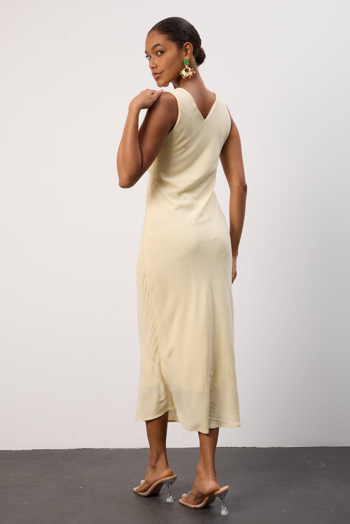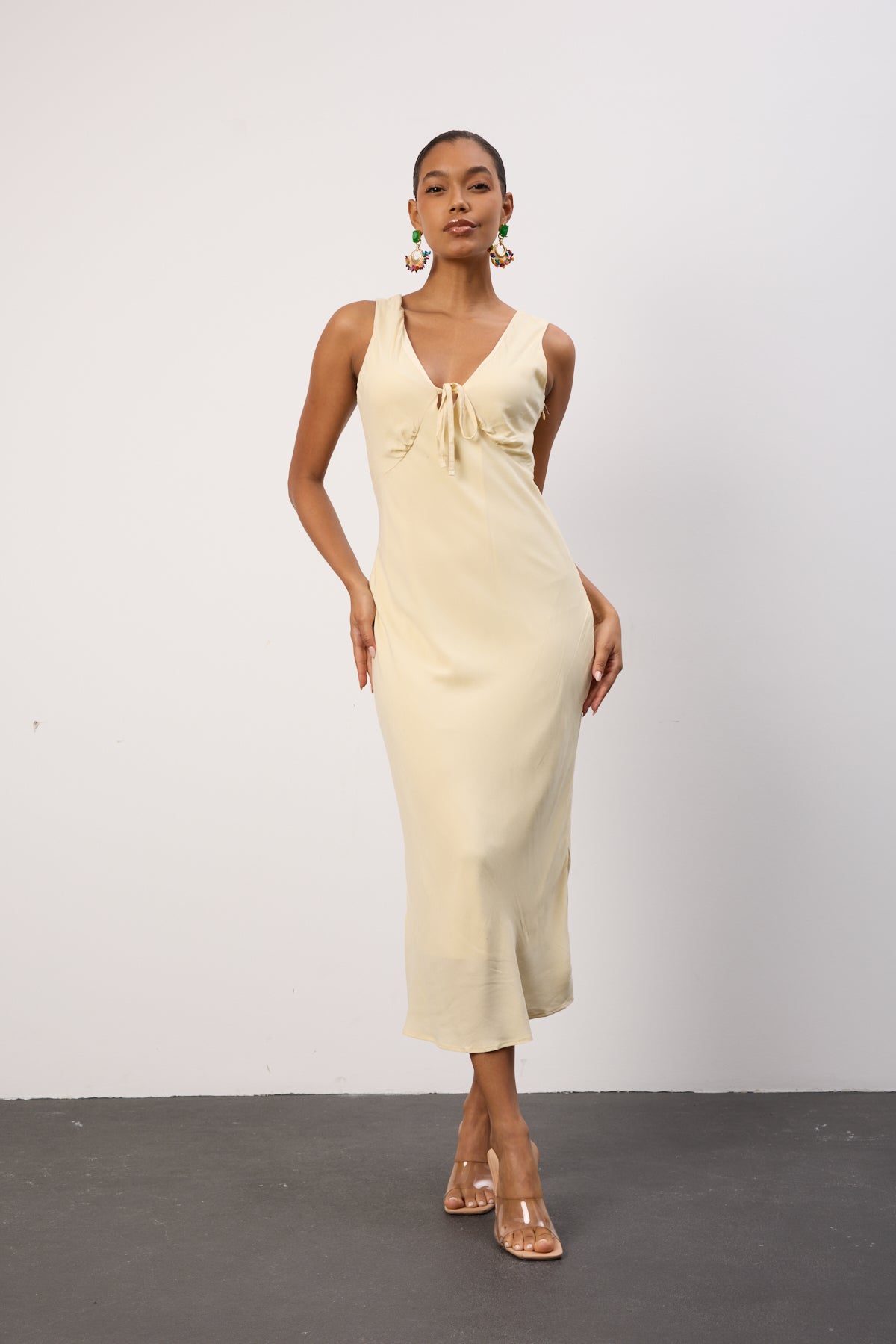 Minimalist ve zarif tasarımıyla öne çıkan bu midi elbise, tereyağı sarısı rengiyle sofistike bir görünüm sunar.